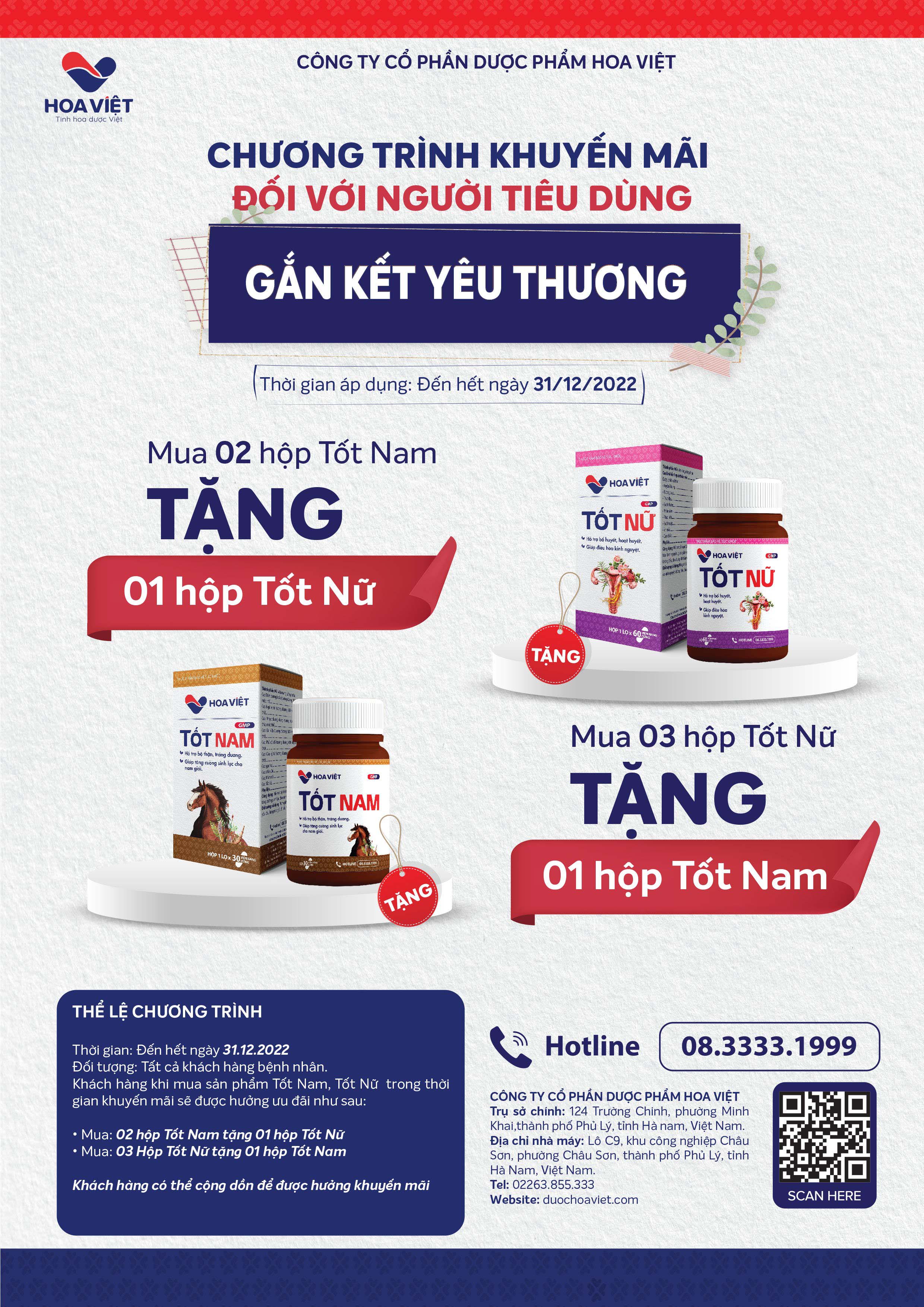 Với mục đích tri ân khách hàng đã tin tưởng và đồng hành với Công ty trong thời gian qua, Công ty Cổ Phần Dược Phẩm Hoa Việt xây dựng chương trình siêu khuyến mại ra mắt sản phẩm mới thuốc Tốt Nữ và thực phẩm bảo vệ sức khoẻ Tốt Nam.