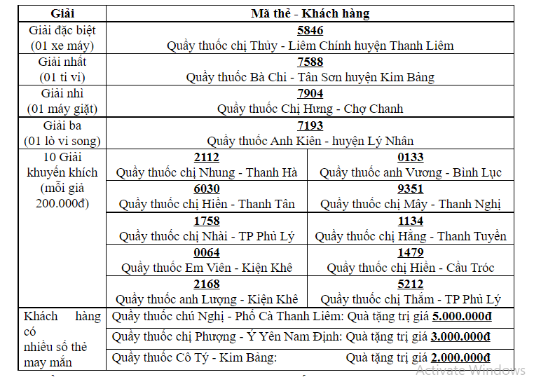 Và kết quá đã tìm ra được những khách hàng may mắn với những mã số thẻ may mắn như sau: