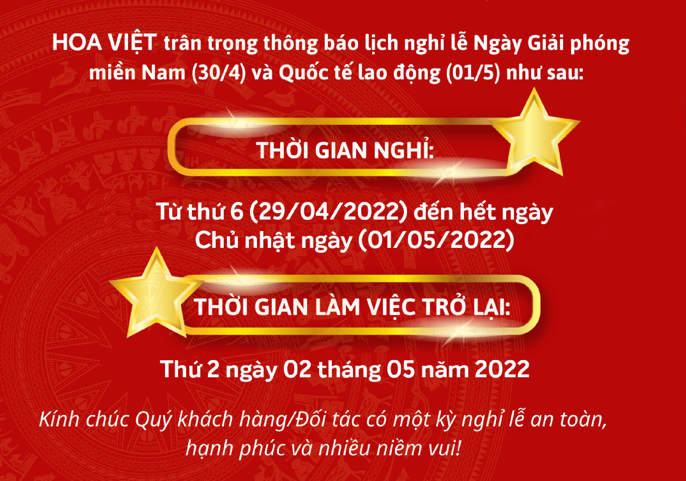 Công ty Dược Hoa Việt gửi tới bạn lịch nghỉ 30/4, 1/5 của năm 2022 như sau.
