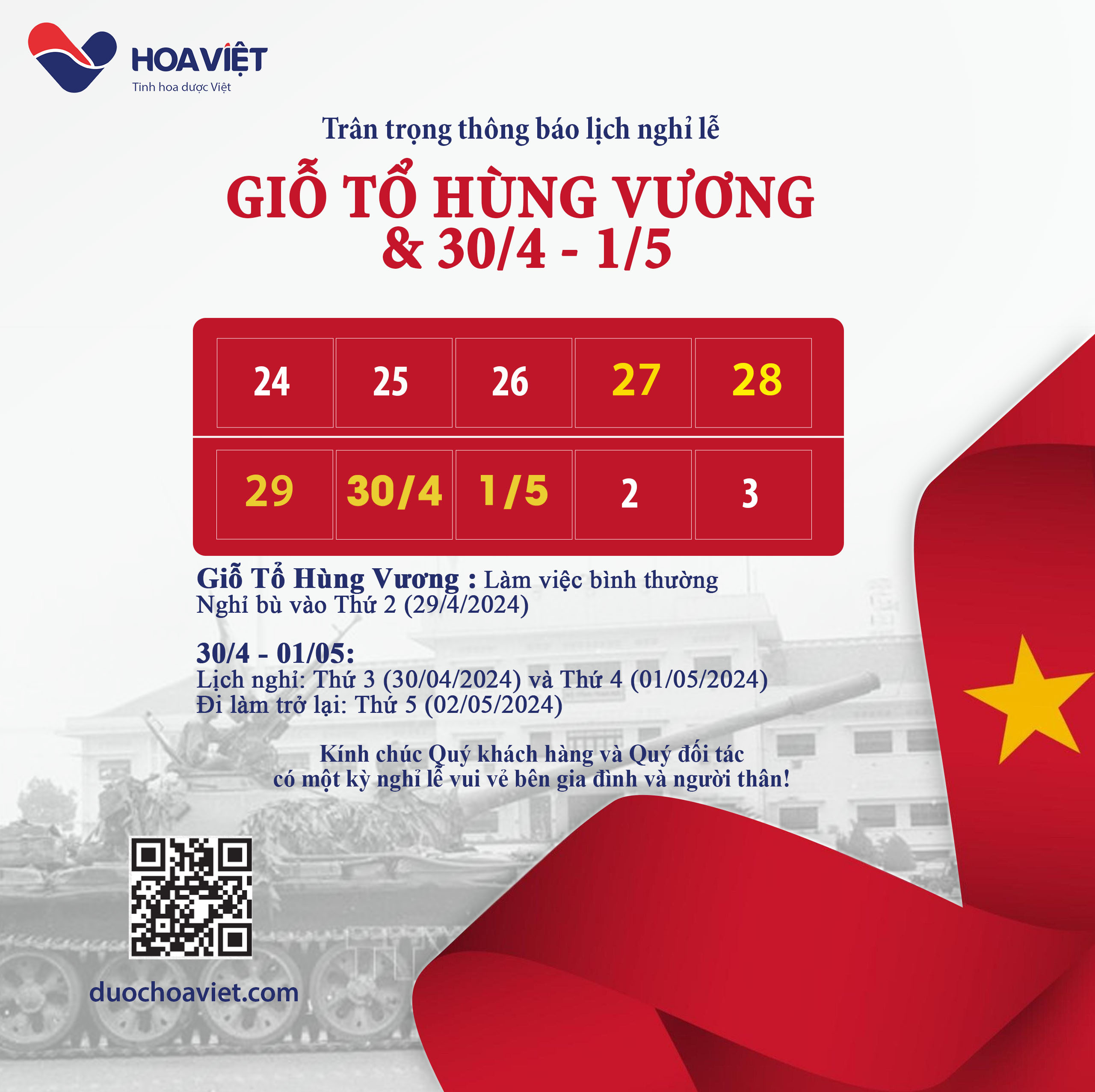 Công ty cổ phần Dược phẩm FDV Việt Nam (Dược Hoa Việt) trân trọng thông báo lịch nghỉ lễ Giỗ Tổ Hùng Vương (10/3 Âm lịch), ngày Giải phóng Miền Nam 30/4/2024 và ngày Quốc tế Lao động 01/5/2024 như sau: