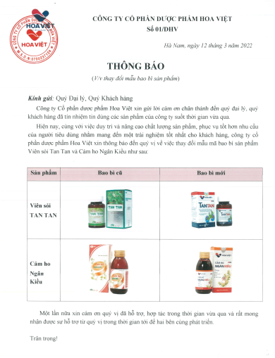 Hiện nay, cùng với việc duy trì và nâng cao chất lượng sản phẩm, phục vụ tốt hơn nhu cầu người tiêu dùng nhằm mang đến trải nghiệm tốt nhất cho khách hàng, công ty Cổ phần Dược Phẩm Hoa Việt xin thông báo đến quý vị về việc thay đổi mẫu bao bì sản phẩm Viên sỏi Tan Tan và Cảm ho Ngân Kiều như sau: